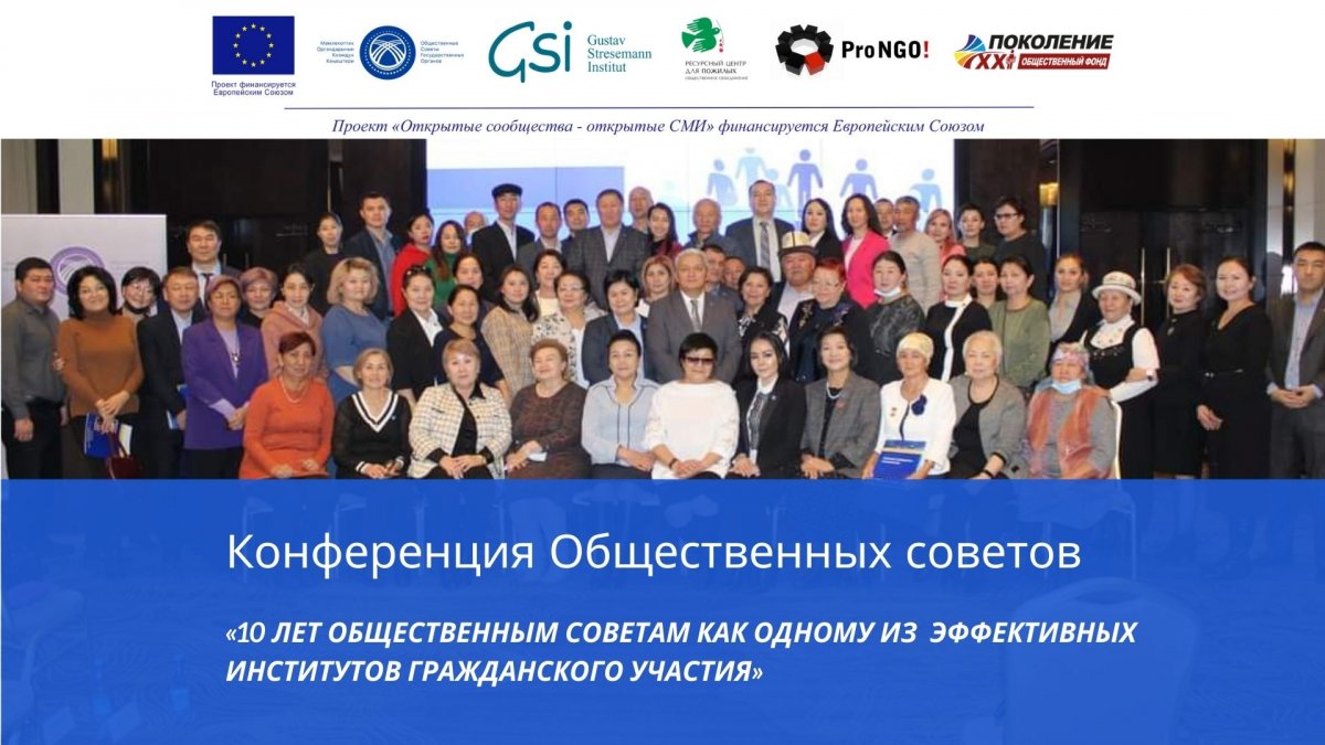 18 ноября 2021 г. в городе Бишкек состоялась юбилейная конференция Общественных Советов Государственных Органов КР (ОСГО КР) на тему «10 лет Общественным советам как одному из эффективных институтов гражданского участия». Данное мероприятие было организовано в партнерстве с проектом Европейского Союза «Открытые сообщества — открытые СМИ».