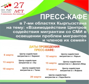 Пресс-кафе направлены на построение сотрудничества и взаимодействие Центров содействия мигрантам, государственных структур и  представителей местных и районных  средств массовой информации в освещении проблем миграции в каждом из 7-ми регионов Кыргызской Республики. Юристы Центров поделятся с участниками встречи актуальными проблемами, с которыми сталкиваются мигранты и члены их семей, а также совместно  выработают формы взаимодействия Центров содействия мигрантам и СМИ в освещении проблем миграции конкретного региона.