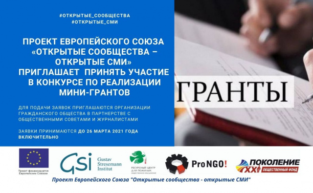 Проект Европейского Союза «Открытые сообщества – открытые СМИ» приглашает принять участие в конкурсе мини-грантов 01.02.2021Категории Новости, Открытые сообщества - открытые СМИ