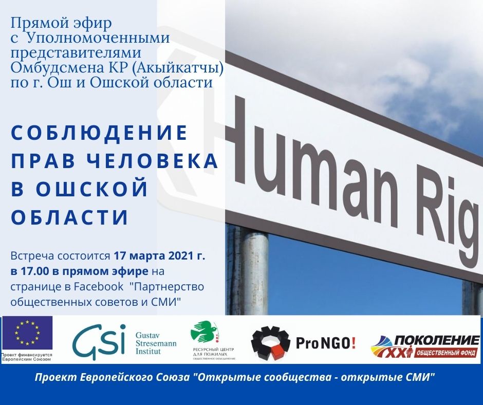Команда проекта Европейского Союза «Открытые сообщества – открытые СМИ» приглашает 17 марта 2021 г. с 17.00 до 18.00 принять участие в прямом эфире на тему: «Соблюдение прав человека в Ошской области».