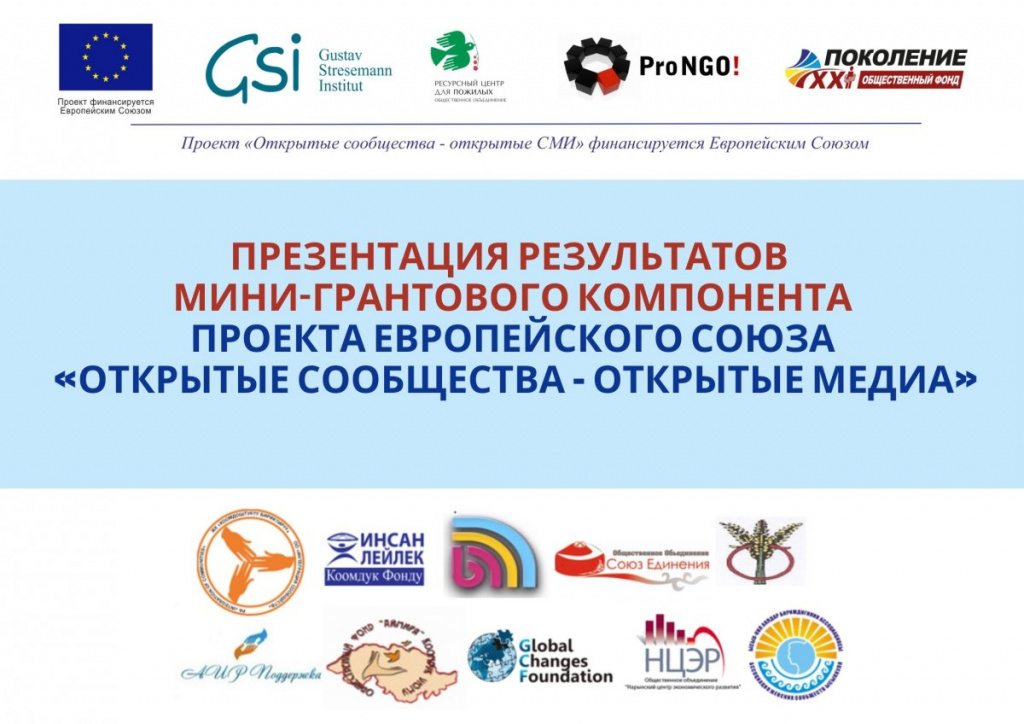 Проект Европейского Союза «Открытые сообщества — открытые СМИ» реализуется Консорциум неправительственных организаций Институт Густава Штреземана (Германия), Pro NGO! e.V. (Германия), ОО «Ресурсный центра для пожилых» (Кыргызстан), ОФ «Поколение XXI» (Кыргызстан).