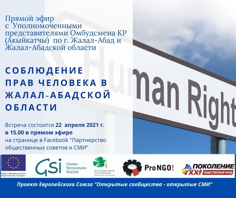 Команда проекта Европейского Союза «Открытые сообщества – открытые СМИ» приглашает 22  апреля  2021 г. с 15.00 до 16.00 принять участие в прямом эфире на тему: «Соблюдение прав человека в Жалал-Абадской области».